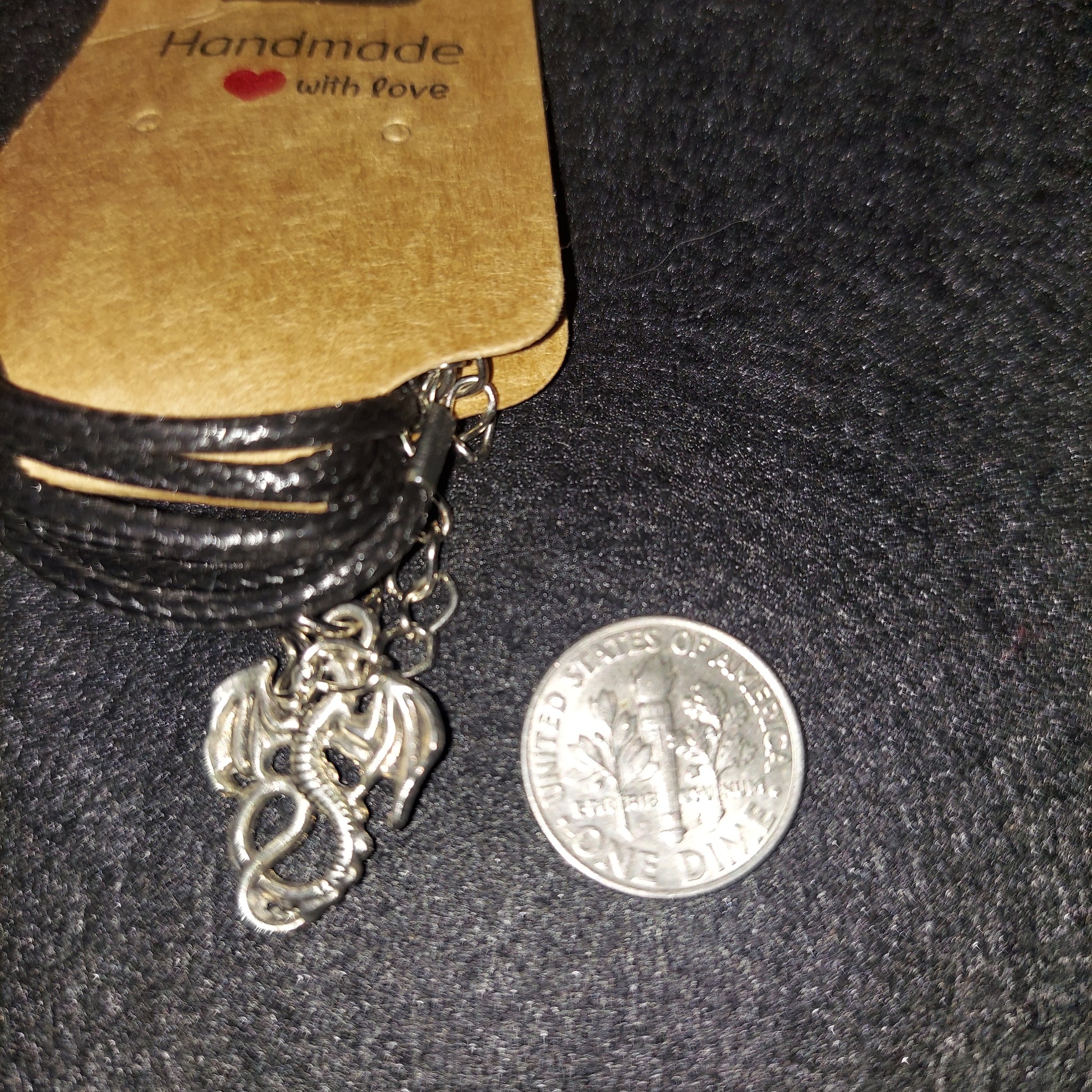 "This dragon necklace is the ultimate accessory for any fantasy lover! Featuring a smooth 17" 1.5mm black waxed faux leather cord with a comfy and sleek fit, and a 2" alloy extension chain for easy length adjustment with a lobster claw clasp. Unleash your inner dragon with this unique and stylish piece!"