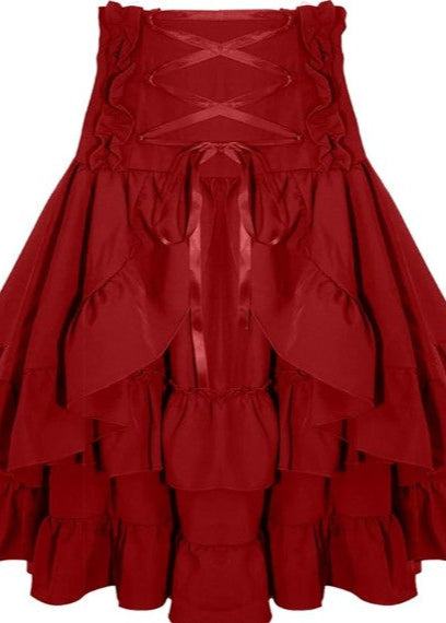Step into your next adventure with this red layered skirt in small, featuring playful front lacing and a comfortable elastic waistband. Adorned with charming ruffles, it blends renaissance flair with pirate and steampunk vibes, making it perfect for LARP battles, feasts, or any event where you want to stand out. Lightweight and easy to move in, this skirt promises both style and freedom as you dive into your epic quests.